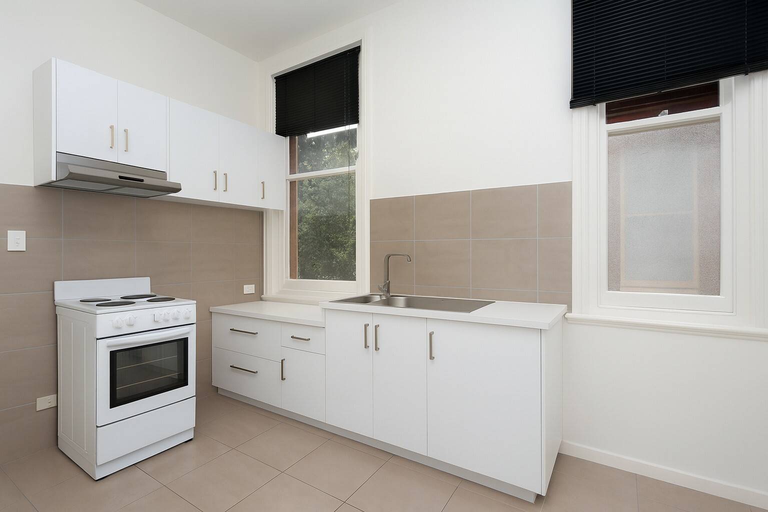 • Kitchen with ample storage, electric cooktop/oven, and tiled splashbacks