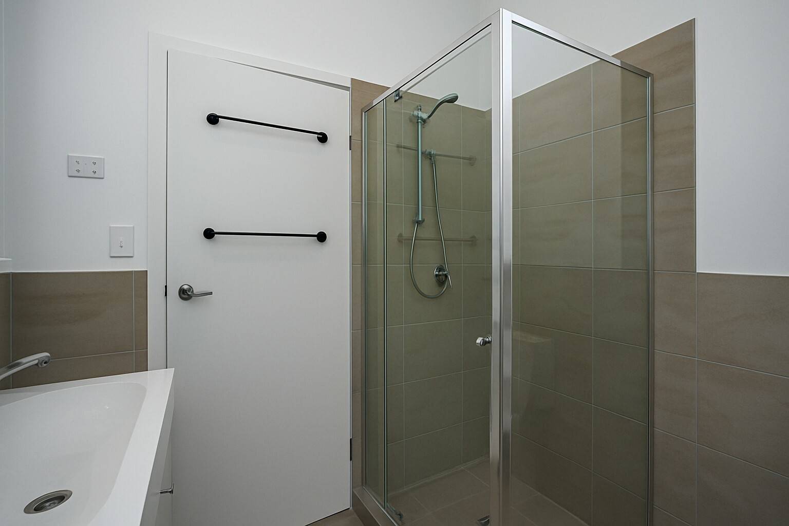 • Modern bathroom with glass shower door and contemporary fittings
