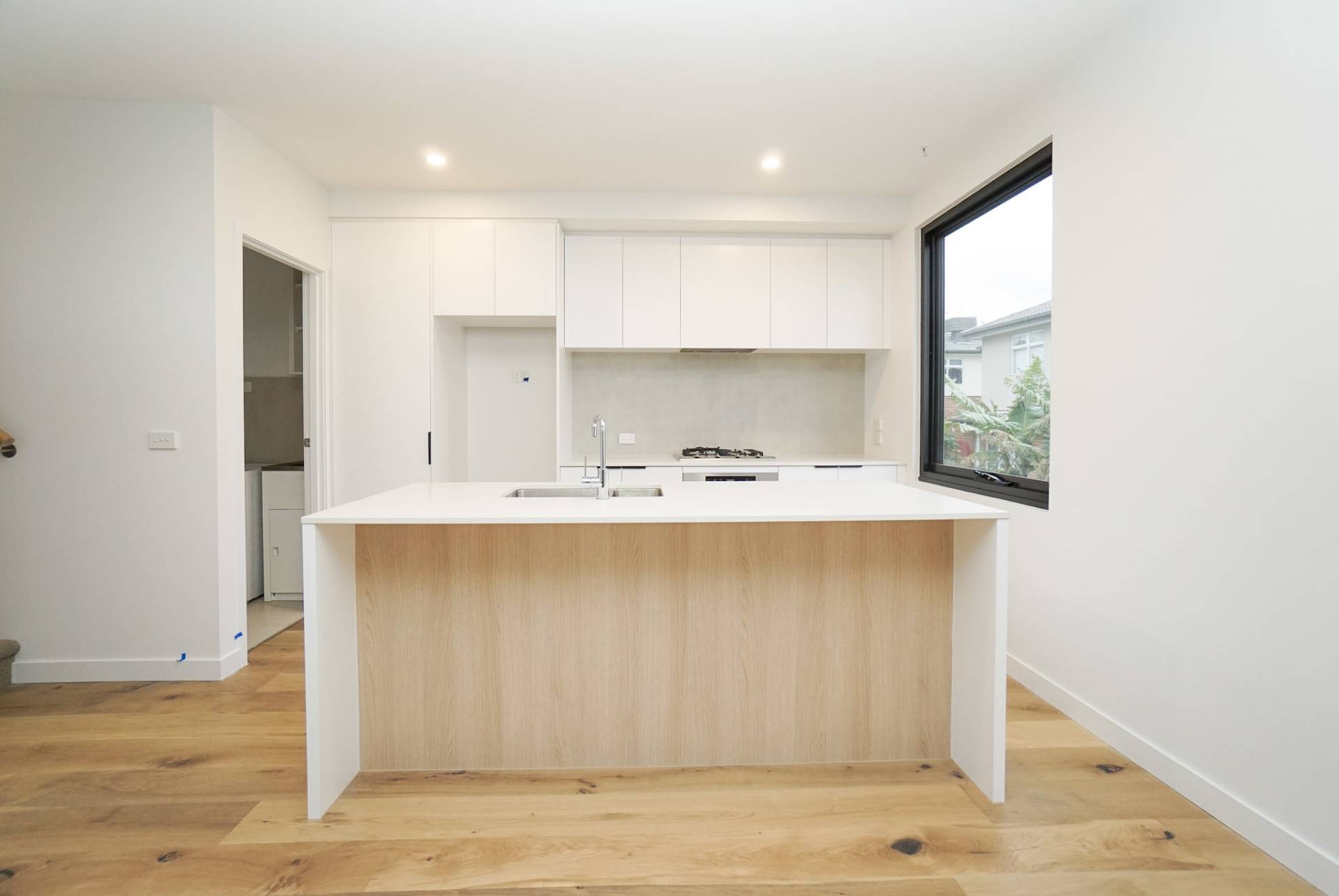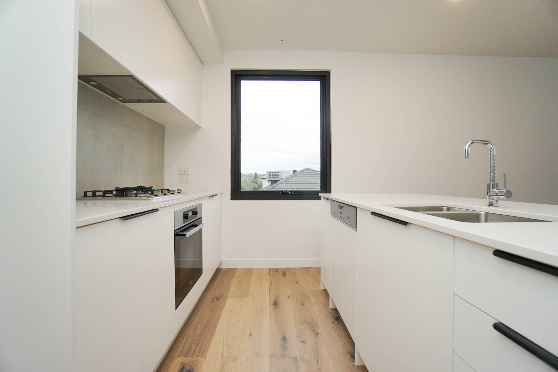 • Kitchen with clean finish bench and island equipped with Miele appliances