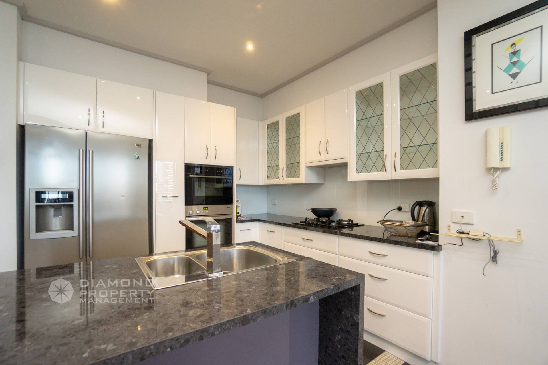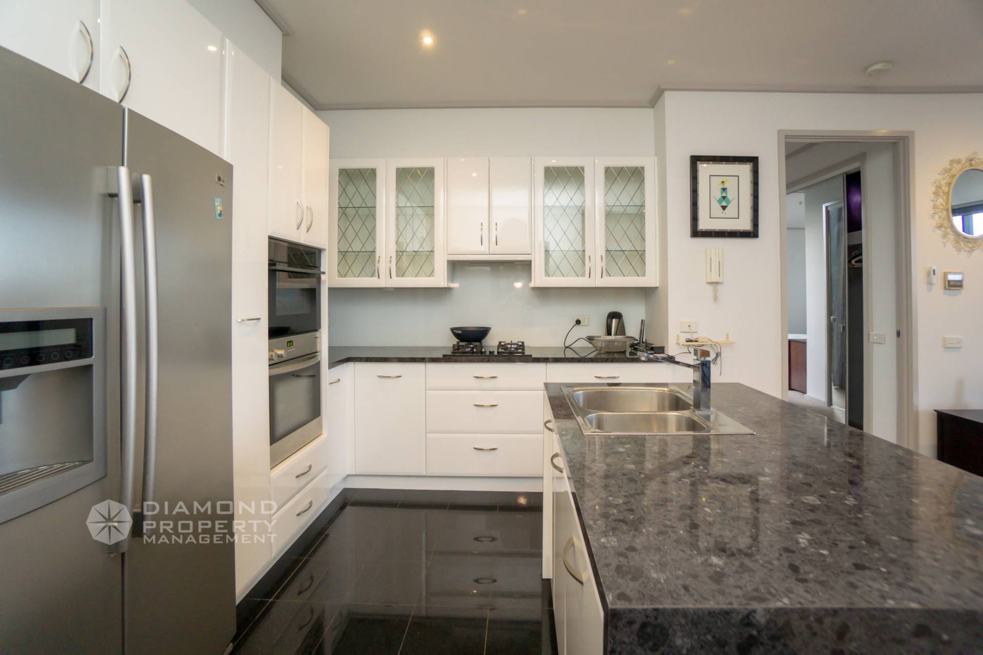 The spacious apartment features open plan living and dining area with plenty of natural light. A functional kitchen equipped with European kitchen appliances (oven, gas-cooking stove, oven, rangehood and etc.), stone island bench with dual sink and a dedicated pantry. The Master bedroom comes with a walk-in-robe, ensuite and bedroom furniture. The second bedroom features access to the balcony and BIR. The main bathroom comes with a dual-sink and dual-mirror setting presenting a romantic amenity. Living room sets with a set of sofa,  tea table and a stunning view for your enjoyment.