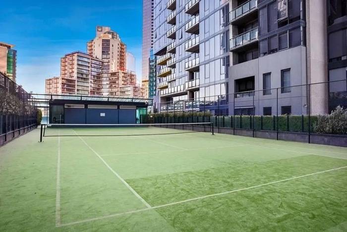 The apartment features ducted heating and cooling, 24-hour building concierge, intercom entry, facilities include heated pool, tennis court, and gymnasium.