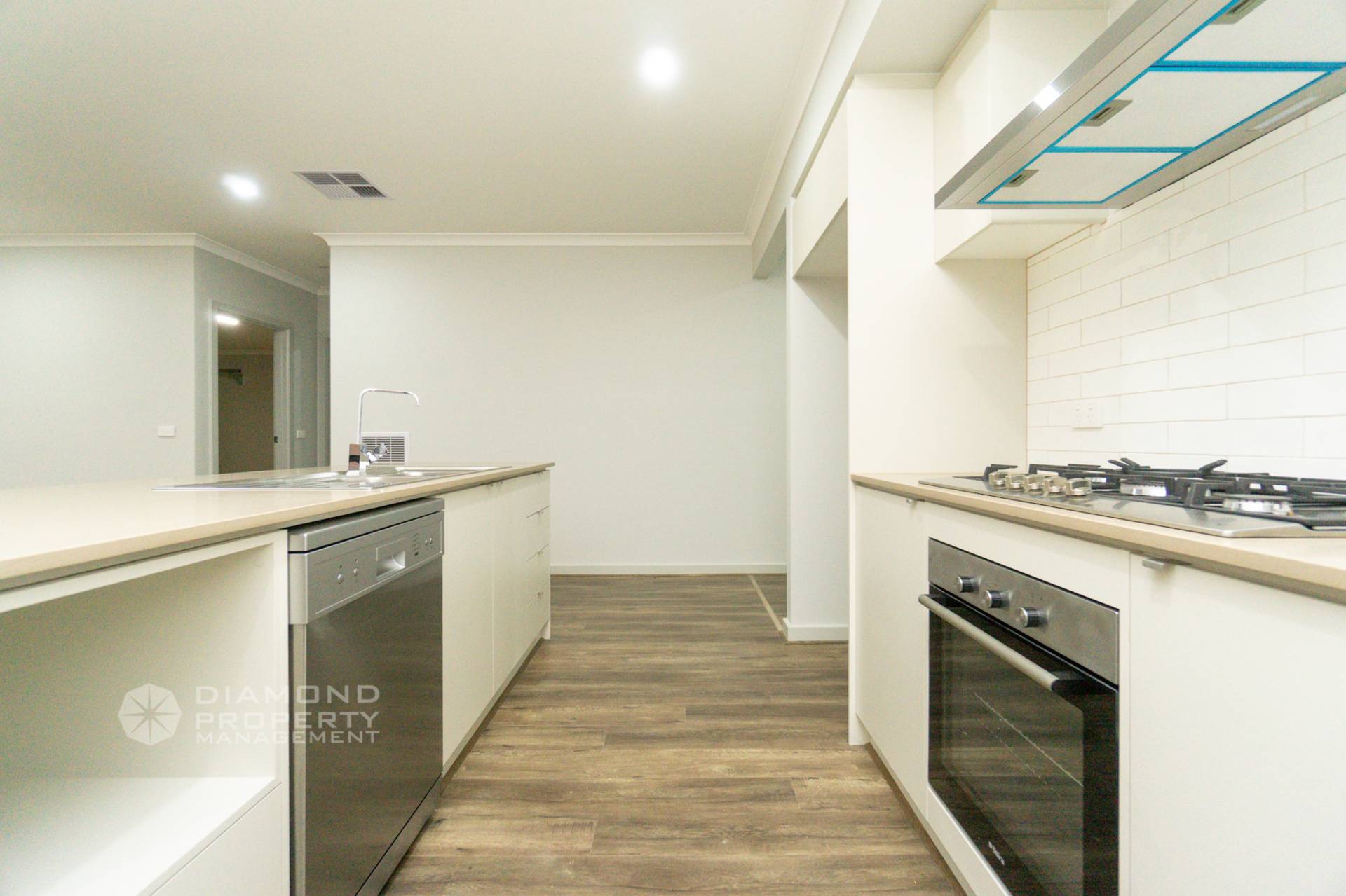- Modern kitchen with gas cooktop, rangehood, dual-sink, oven, full size dishwasher and dedicated kitchen island