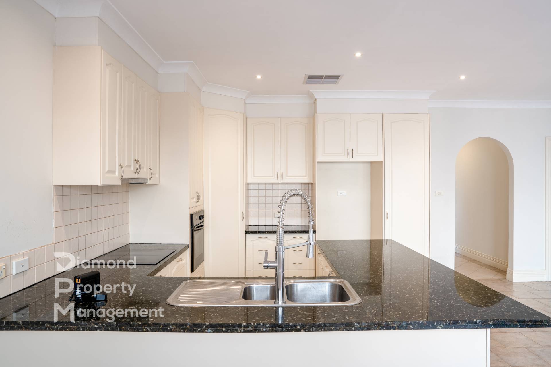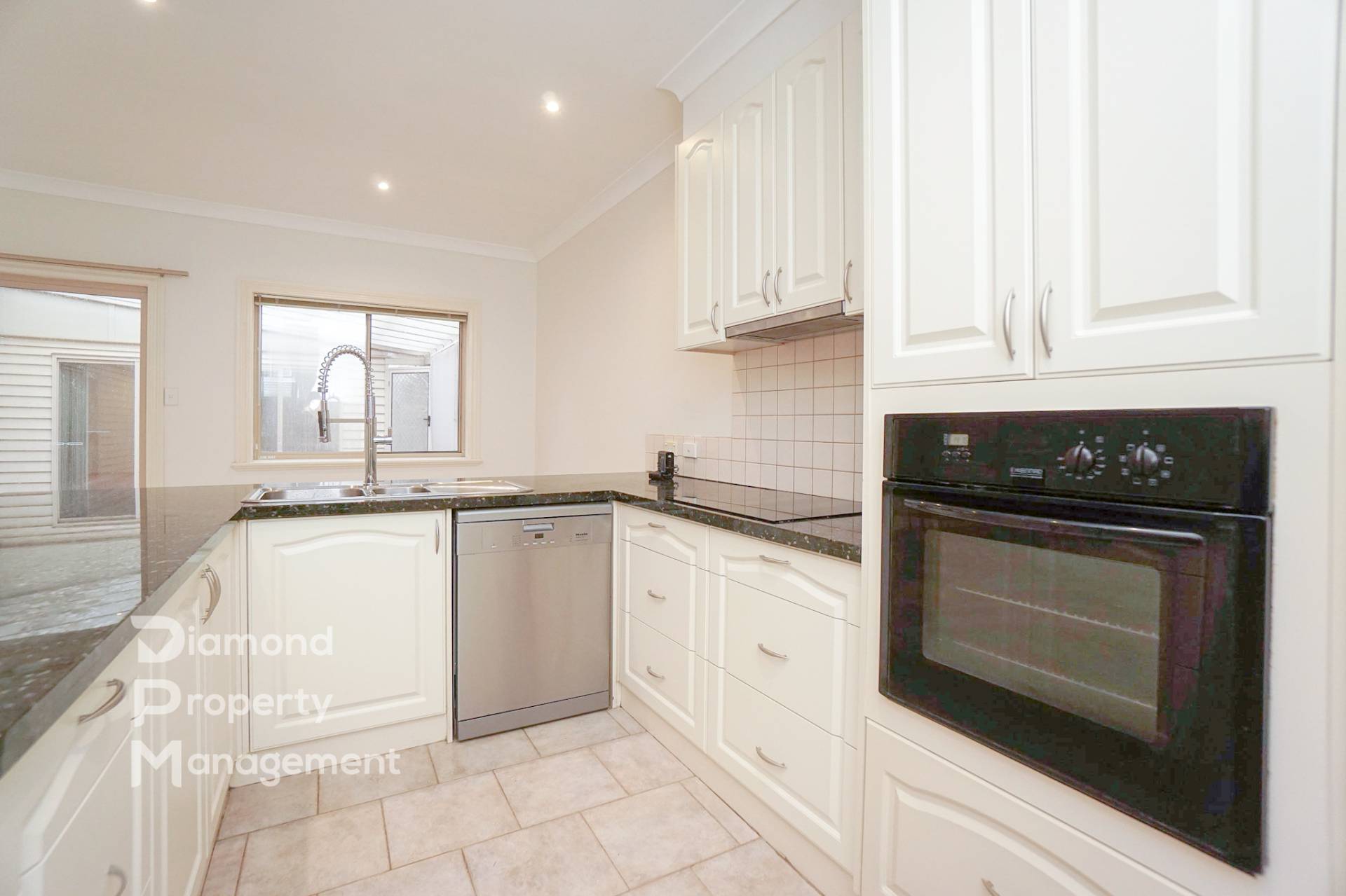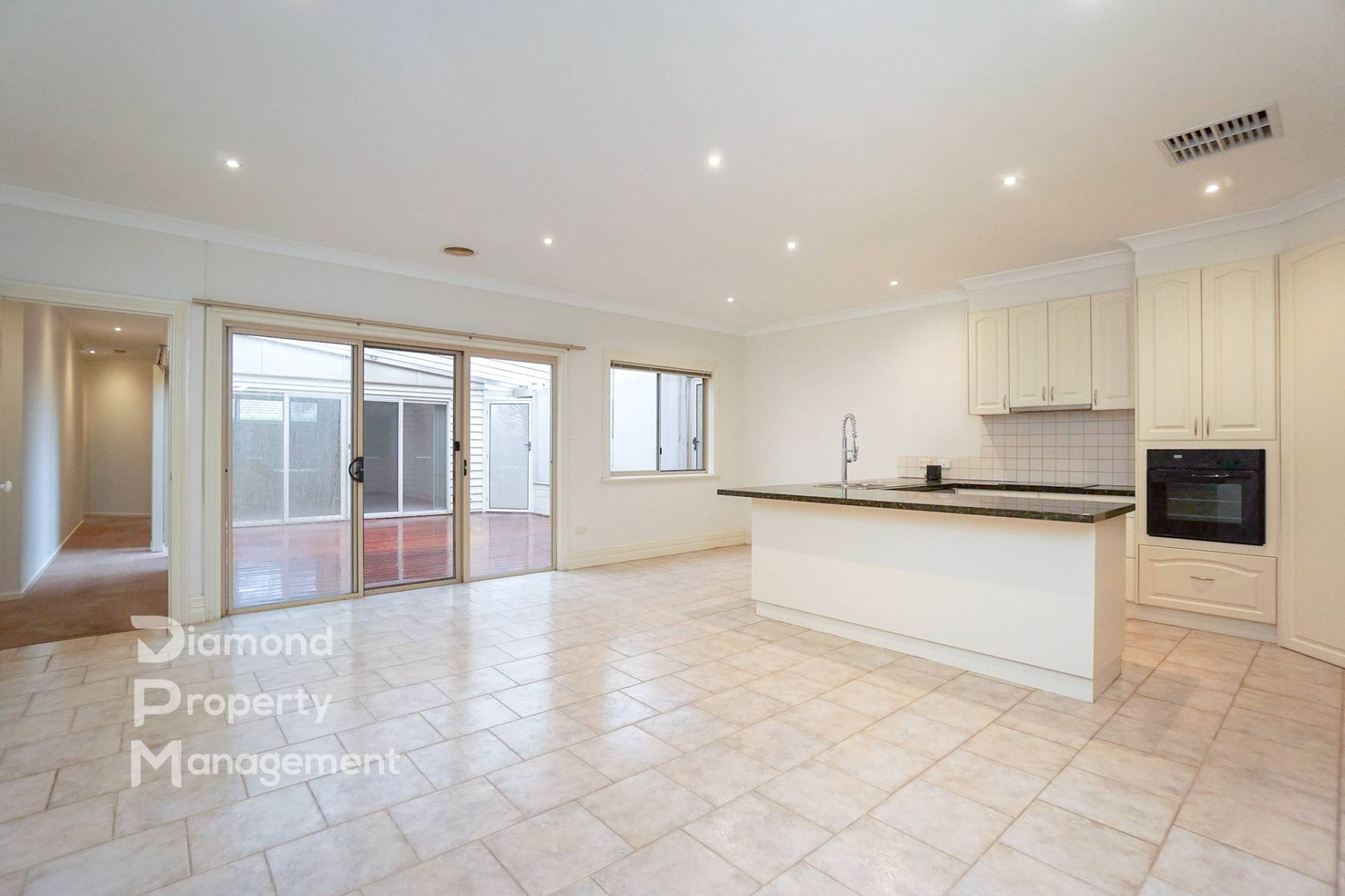 - Open plan kitchen and dining area; kitchen with stone bench-tops and quality appliances including induction cooktop